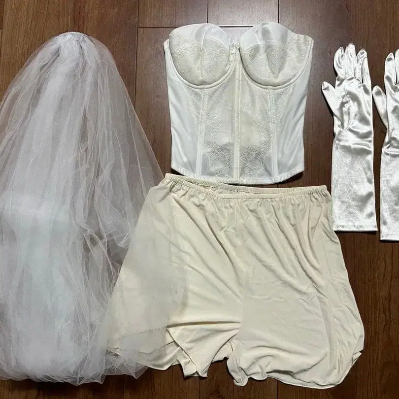 자동 번역되었어요. 원문보기브라이덜 이너, 그로브, 베일 세트입니다. 당일만 사용했으며, 자택 클리닝 완료했습니다.