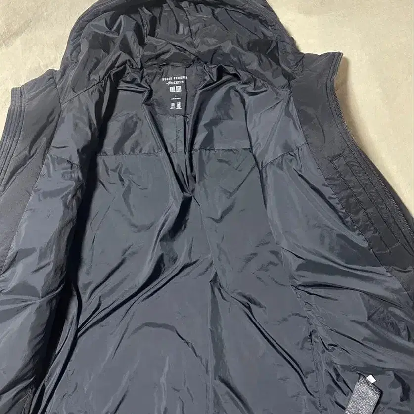 나일론 소재의 블랙 다운 자켓, L 사이즈, 후드 부착. 유니클로와 JW Anderson의 콜라보레이션에 의한, 로저 페더러 컬렉션