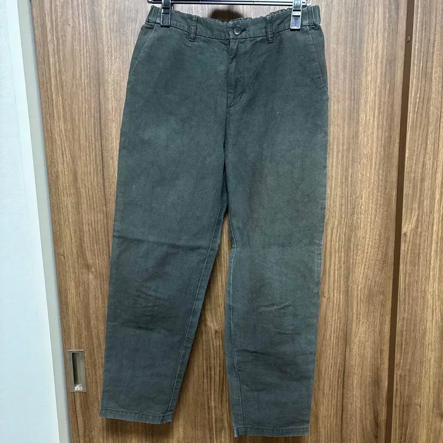 깔끔한 슬림 실루엣의 팬츠입니다. 허리는 뒷부분 절반이 밴딩 처리되어 있습니다. 심플한 면 100% 팬츠라 어떤 상의와도 잘 어울리며, 연중 착용 가능합니다. 색상은 그린빛이 도는 짙은 그레이 느낌입니다. 몇 번 착용했지만 눈에 띄는 얼룩 없이 상태 좋습니다. ★ 사이즈 ★ 36 (밑위→28cm, 인심→64cm, 허리→70cm ※ 뒷부분 절반 밴딩, 힙→98cm) ※ 모두 평평하게 놓은 상태로 측정 ★ 소재 ★ 면 100%