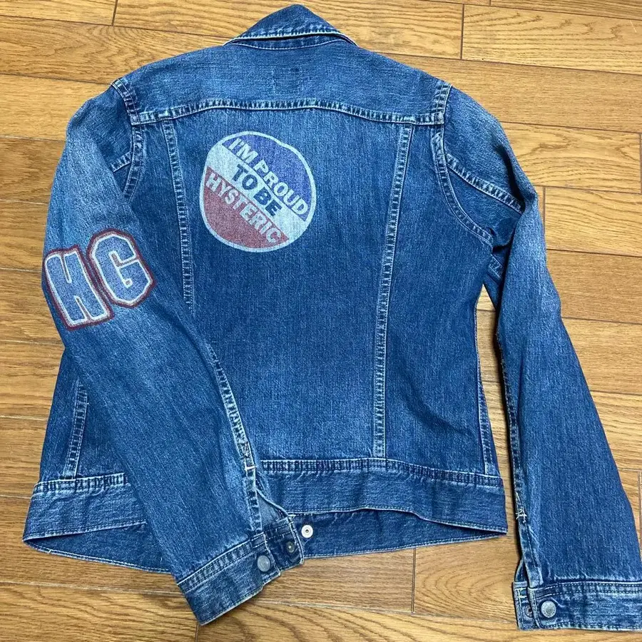 뒷면에 프린트와 왼쪽 소매에 자수가 들어간 다크 데님 자켓. 부드럽고 착용감이 좋은 원단 - 디자인: 뒷면에 [ IM PROUD TO BE HYSTERIC ] 프린트 - 자수: 왼쪽 소매에 [ HG ] 자수 - 포켓: 앞면에 플랩 포켓 2개 - 색상: 다크 데님 - 스타일: 데님 자켓 가슴 너비 45, 기장 54 방문해 주셔서 감사합니다. 정말 귀여워요 ♪ 사이즈 - FREE SIZE