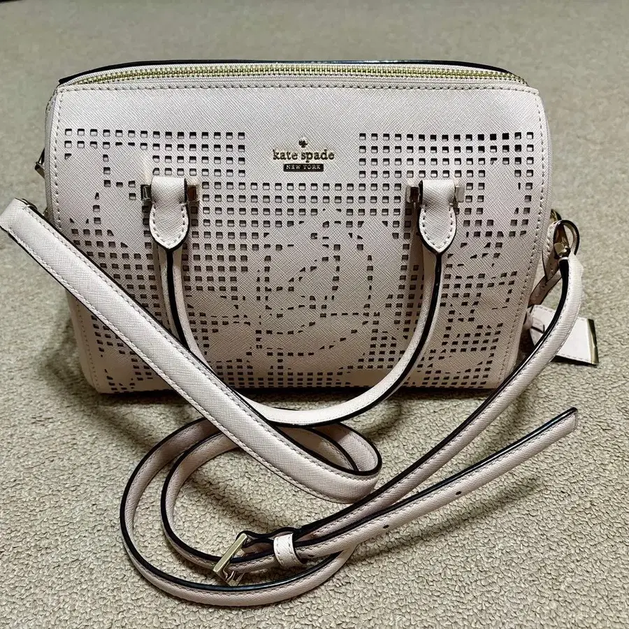 꽃무늬 펀치 디자인이 특징인 숄더백. 거의 미사용 새상품급입니다. 안에는 큰 포켓 1개, 지퍼 달린 포켓이 1개 있습니다. 26.5(가로) x 18(세로) x 12(바닥)cm 정도입니다. - 브랜드: kate spade 케이트 스페이드 - 색상: 핑크 - 디자인: 꽃무늬 펀치 디자인 - 내부: 스트라이프 패턴 안감 - 스트랩: 숄더 스트랩 포함 방문해 주셔서 감사합니다.