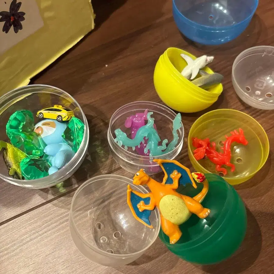 리자몽, 공룡, 자동차 미니어처 등 다채로운 캐릭터가 모인 피규어 세트.