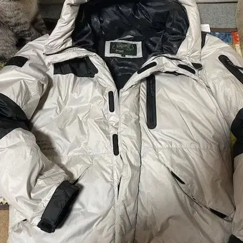 익스트림 콜드 웨더용 실버와 블랙 다운 자켓, 폴리에스테르 100% 소재로 부드러운 안감을 갖추고 있습니다.