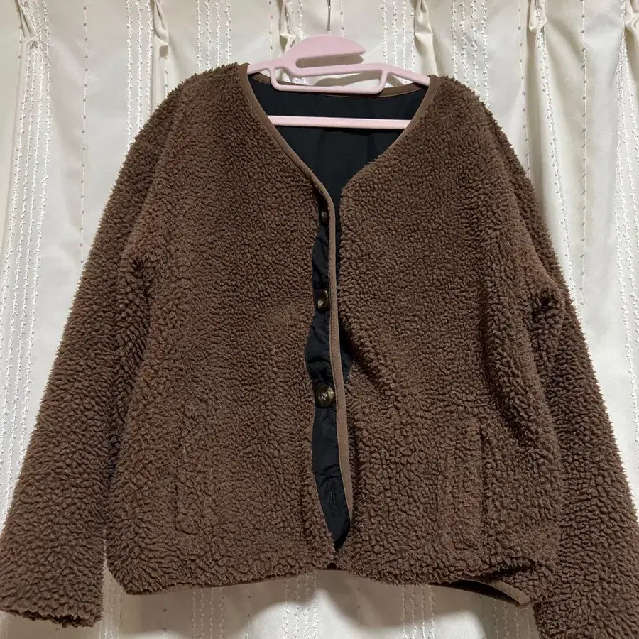 보아 소재의 브라운 자켓, 나일론 안감, 프론트 버튼 포함.
