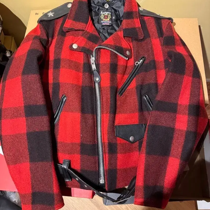 울과 가죽 더블 라이더 자켓, 빨간색 블랙 체크 무늬.