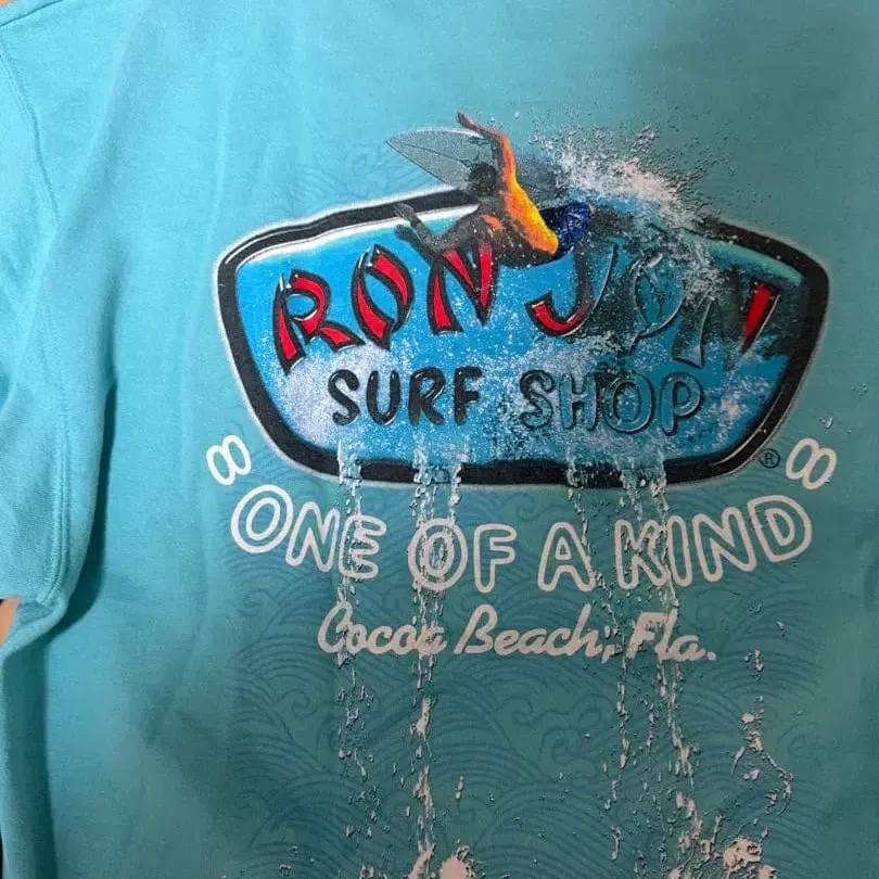 아쿠아 블루 색상의 크루넥 트레이닝복, RON JON SURF SHOP의 그래픽 프린트 포함.