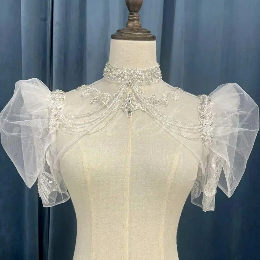 [ 볼레로만 ] 비즈와 자수가 놓인 화이트 볼레로입니다. 웨딩 드레스 잡화로도 추천합니다. 촬영용으로 구매했으나, 블랙 드레스를 입기로 하여 시착만 한 미사용품입니다. 정가 10,520엔 - 색상: 화이트 - 디자인: 퍼프 슬리브 - 장식: 비즈와 자수 - 백 스타일: 단추식 방문해 주셔서 감사합니다.