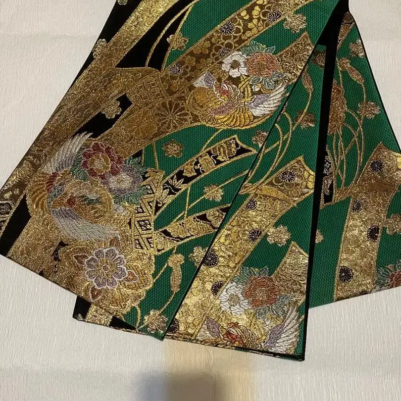 금실 자수로 봉황과 꽃무늬가 장식된 그린과 블랙의 후쿠로 오비. - 색상: 그린/블랙 - 디자인: 금실 자수로 봉황과 꽃무늬 - 사이즈: 약 폭 30cm - 길이 약 425cm 방문해 주셔서 감사합니다.