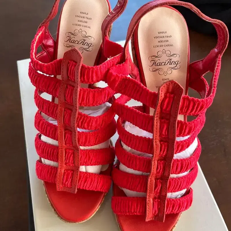 레드 스트랩 디자인에 코르크 힐 샌들.
