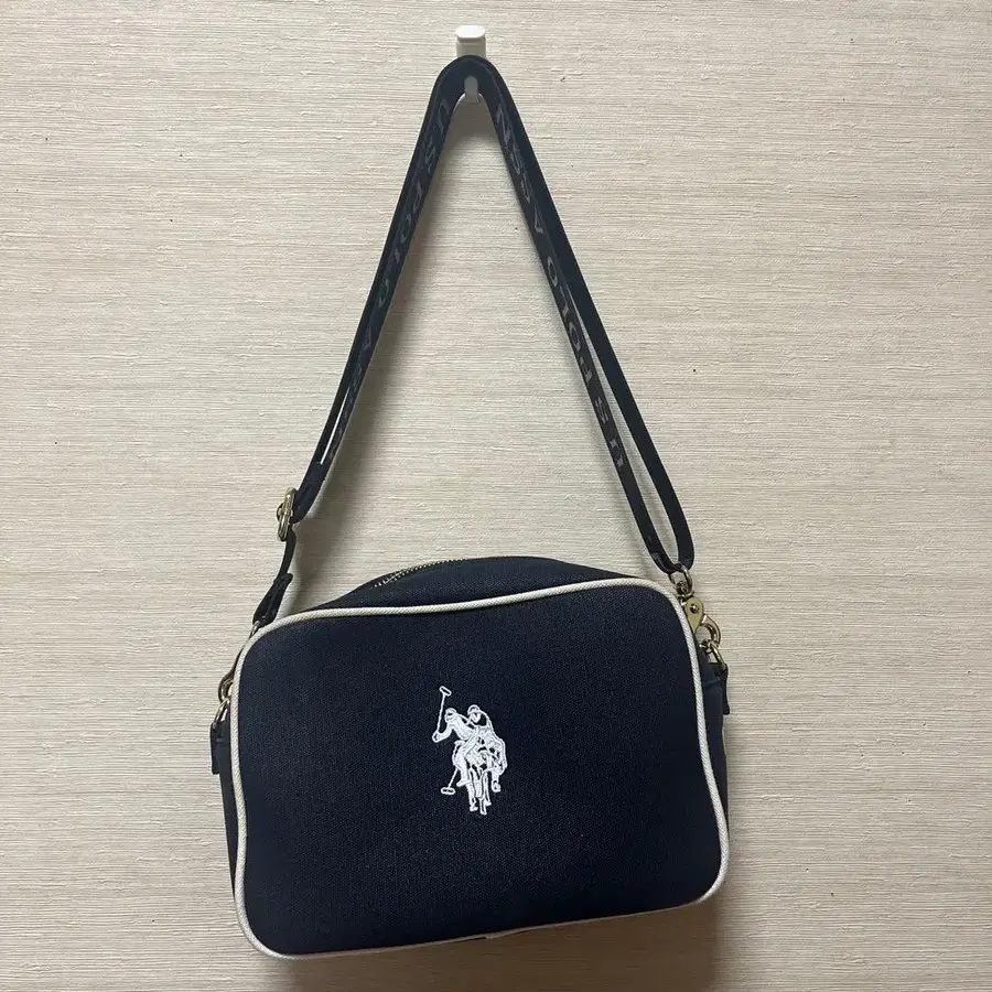 네이비 색상의 숄더백입니다. 로고 자수와 번호 3이 있으며, 지퍼 포켓이 있습니다.
