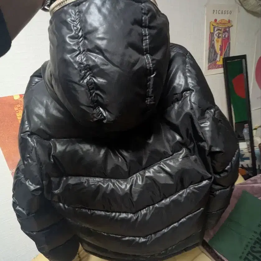 광택이 나는 블랙 다운 자켓, 후드 부착, 레드 안감이 특징입니다.