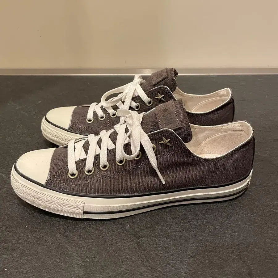 컨버스 올스타 다크 그레이와 다크 브라운이 섞인 듯한 색감과 별 모양 스터드에 첫눈에 반해 정가로 구매했습니다. 몇 번 착용한 새상품급입니다. 사이즈: 27.5cm 컬러: 다크 토프 정가: 약 8,000엔