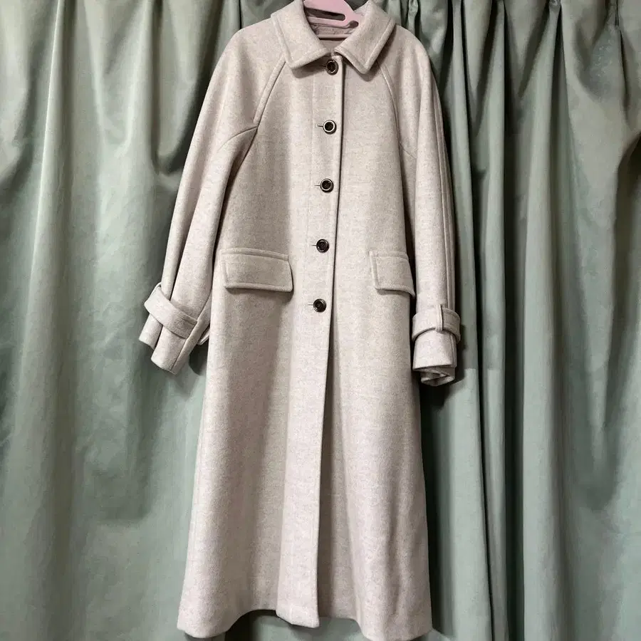 베이지색 롱 코트, 금속제 버튼 포함.