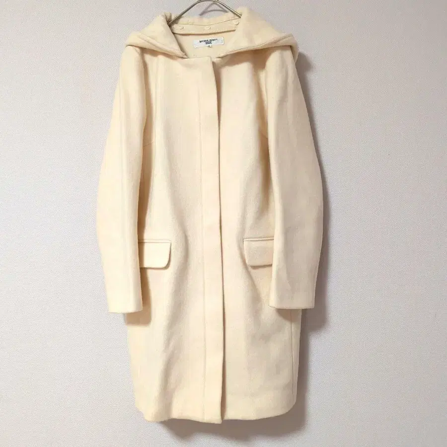 탈부착 가능한 후드가 달린 크림색 울 코트, 앞 포켓이 있어 스타일리시합니다.