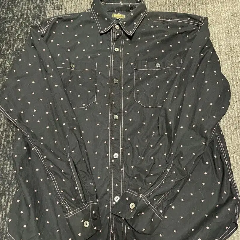 블랙 색상의 별 패턴 디자인 긴팔 셔츠. - 브랜드: CULLNI - 색상: 블랙 - 디자인: 별 패턴 - 스타일: 긴팔 셔츠 - 포켓: 앞면에 2개의 포켓 방문해 주셔서 감사합니다. 사이즈 - XL(LL)