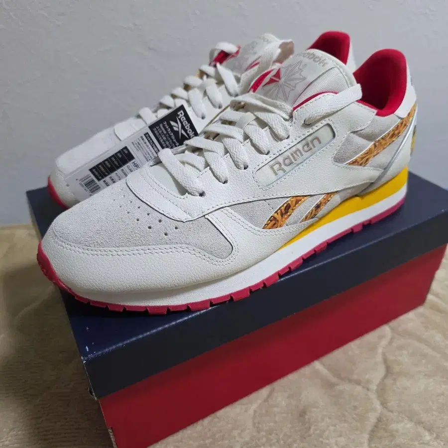 미사용 새상품 화이트와 레드의 배색이 특징인 CLASSIC LEATHER AXB. 베이비스타 라면 콜라보로 개성 있는 1족입니다. - 모델명: CLASSIC LEATHER AXB - 사이즈: 27.5 MM - 색상: 화이트/레드 - 스타일: 러닝 방문해 주셔서 감사합니다.