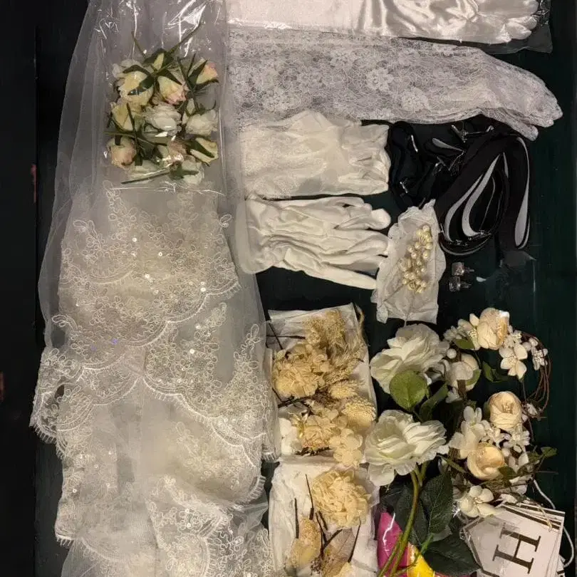 - 아이템 내용: 웨딩 베일, 그로브 (레이스 그로브 x 1, 긴 장갑 x 1, 숏 장갑 x 1, 남성용 그로브 x 1), 조화 머리 장식, 남성용 브라이덜 잡화 (커프스, 서스펜더, 암밴드), 촬영 소품 (가랜드, 종이 풍선)