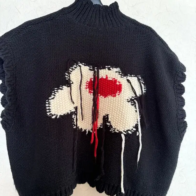 꽃무늬 니트 디자인이 특징인 블랙 슬리브리스 베스트.