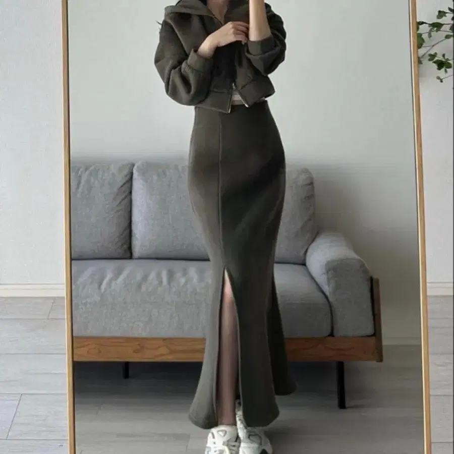 louere 속기모 맨투맨 숏 후드티 + 슬릿 머메이드 스커트