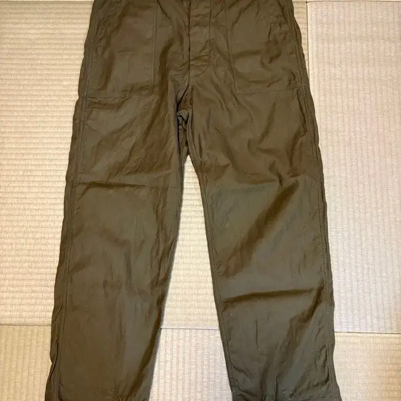 올리브 그린 카고 팬츠, 허리 조절 가능하며 포켓 4개가 있습니다.
