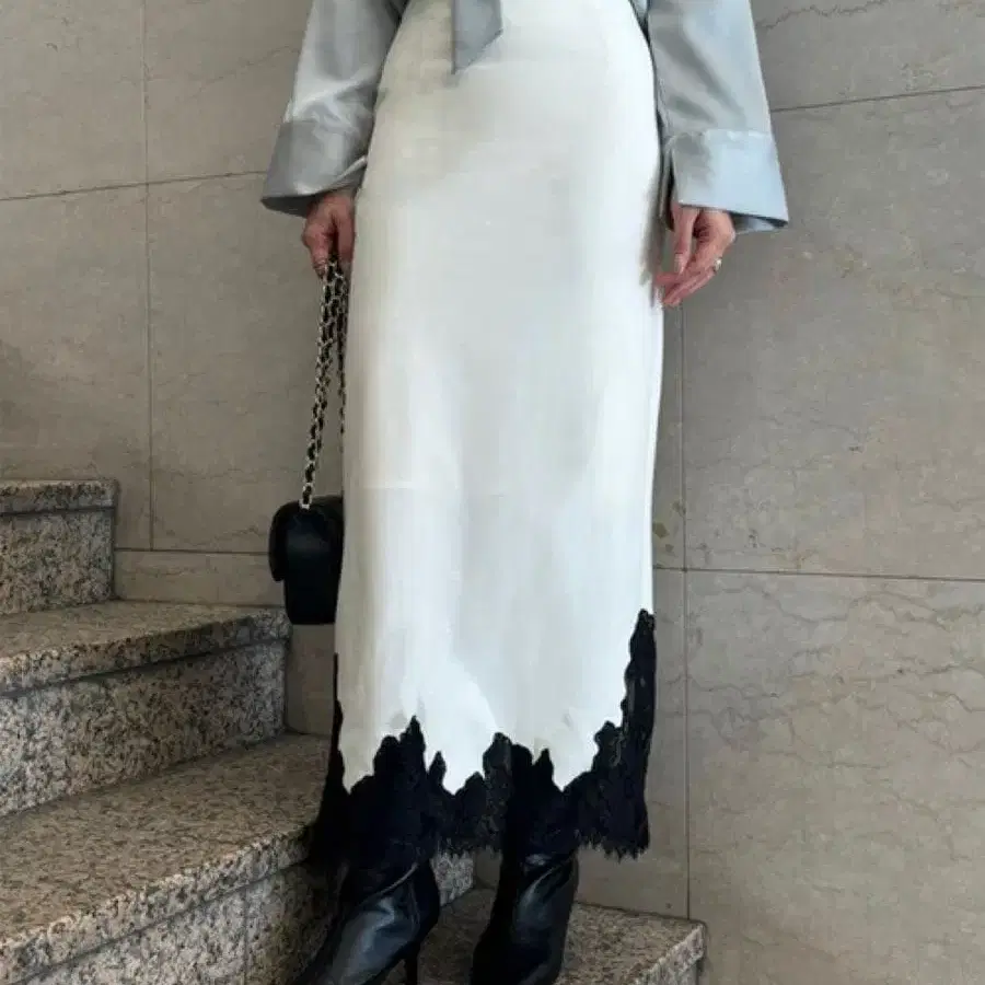 스트레치성이 높고 고급스러운 더블 크로스를 사용하고 고급스러운 레이스 원단을 자수 처리한 타이트 스커트.
