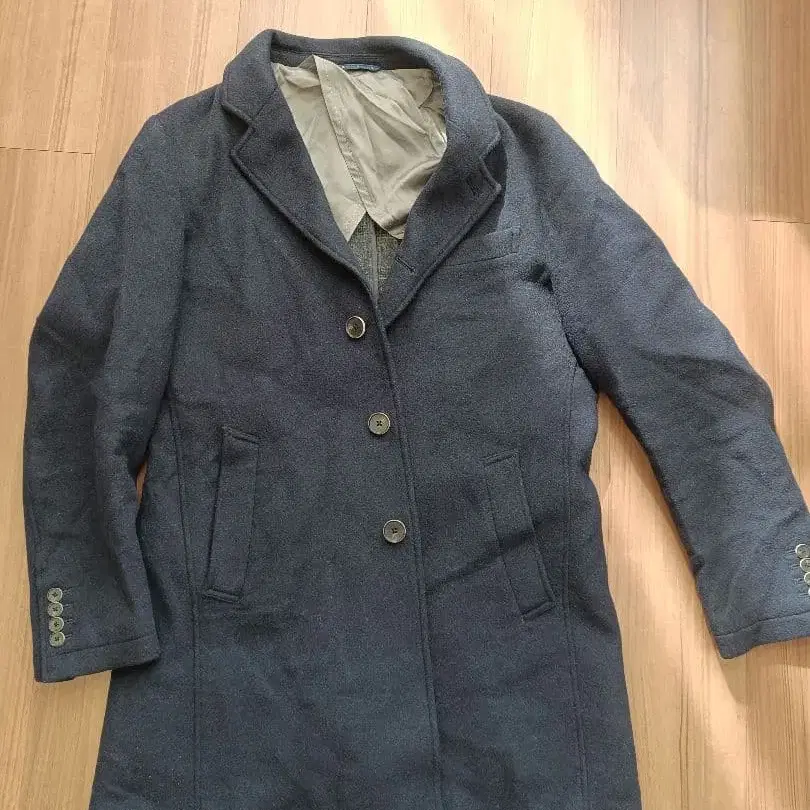 다크 블루 색상의 울 혼방 체스터 코트, 실크 터치 안감 포함.