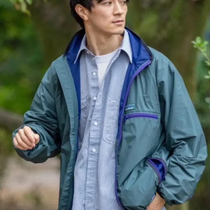 다크 그린 색상의 경량 자켓으로, 지퍼 포켓이 부착되어 기능적입니다.