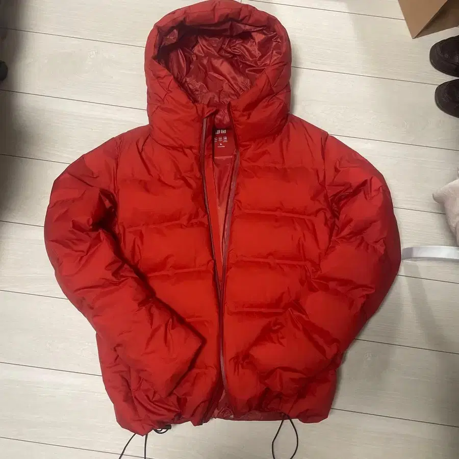 후드 부착 XL 사이즈 레드 다운 자켓.