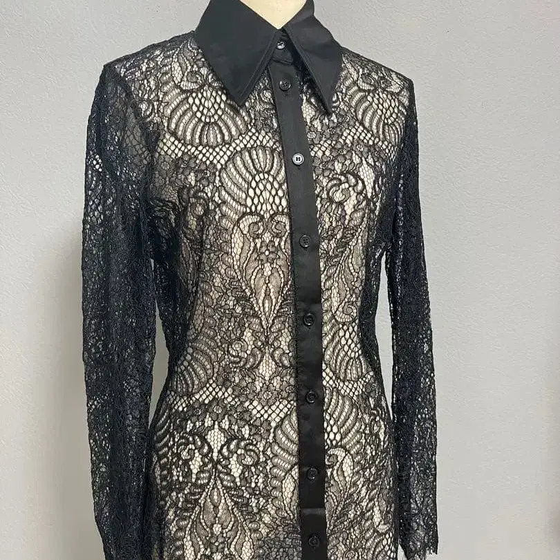 할인 블랙 새틴풍 긴팔 셔츠 (레이스 장식 포함)