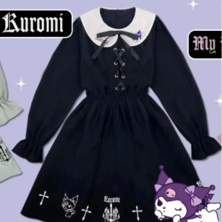 아베일 x Kuromi의 카라 부착 블랙 원피스, 레이스업 디자인과 프린트가 특징. 거의 착용하지 않았습니다. - 브랜드: 아베일 - 색상: 블랙 - 디자인: 카라 부착, 레이스업, 프린트 - 스타일: 무릎 기장, 긴팔 방문해 주셔서 감사합니다. 사이즈 - FREE SIZE