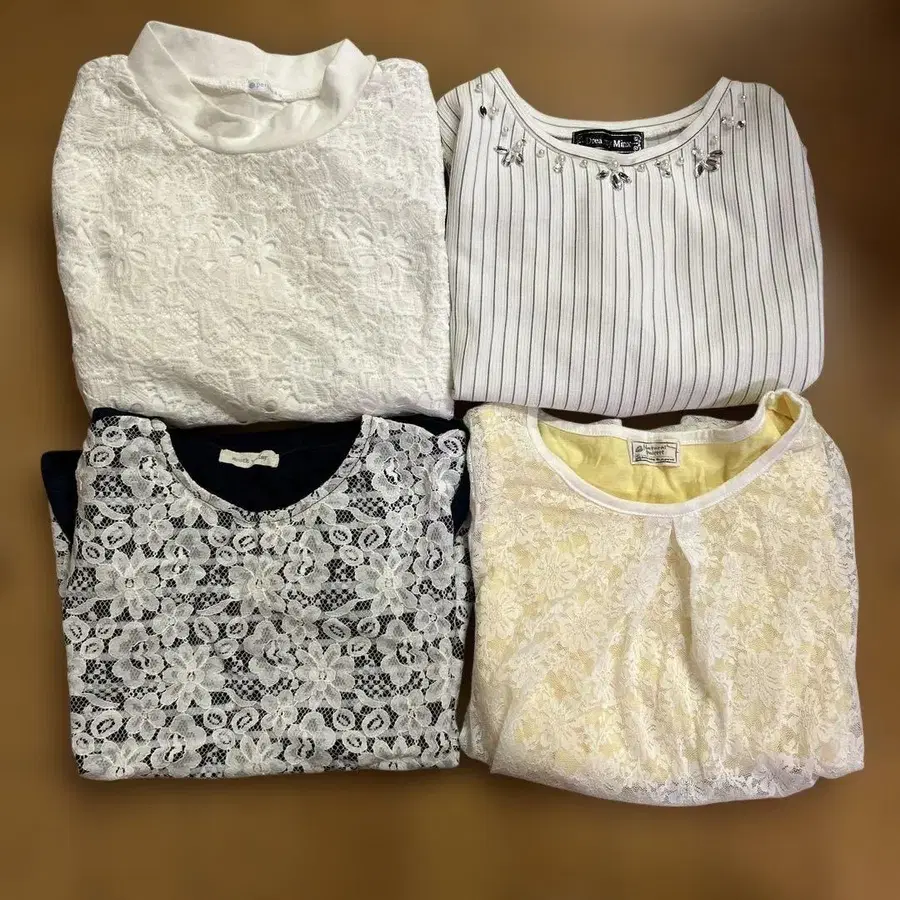 레이스 블라우스 4개 세트입니다. 사이즈는 소매가 레이스인 보더 의류만 L이고 나머지는 M입니다. 몇 번 착용했지만 눈에 띄는 얼룩 없이 새상품급입니다. - 색상: 화이트 - 디자인: 레이스 장식 - 소매: 긴팔 - 스타일: 캐주얼 - 특징: 스트라이프 패턴과 레이스의 조합 방문해 주셔서 감사합니다.