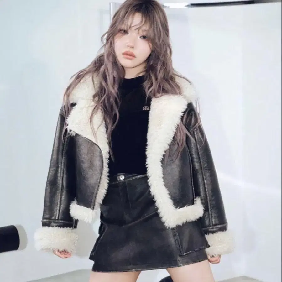 MURUA 오버 컬러 숏 페이크 무스탕 보아 블루종 가죽 자켓 블랙