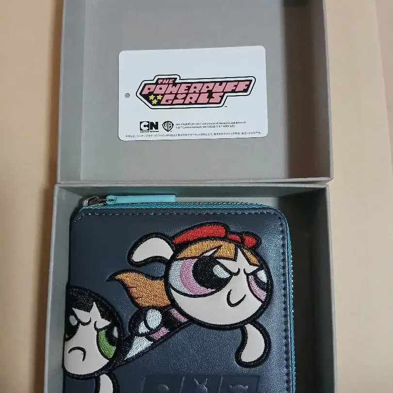 파워퍼프걸즈 자수 디자인이 적용된 접이식 지갑.