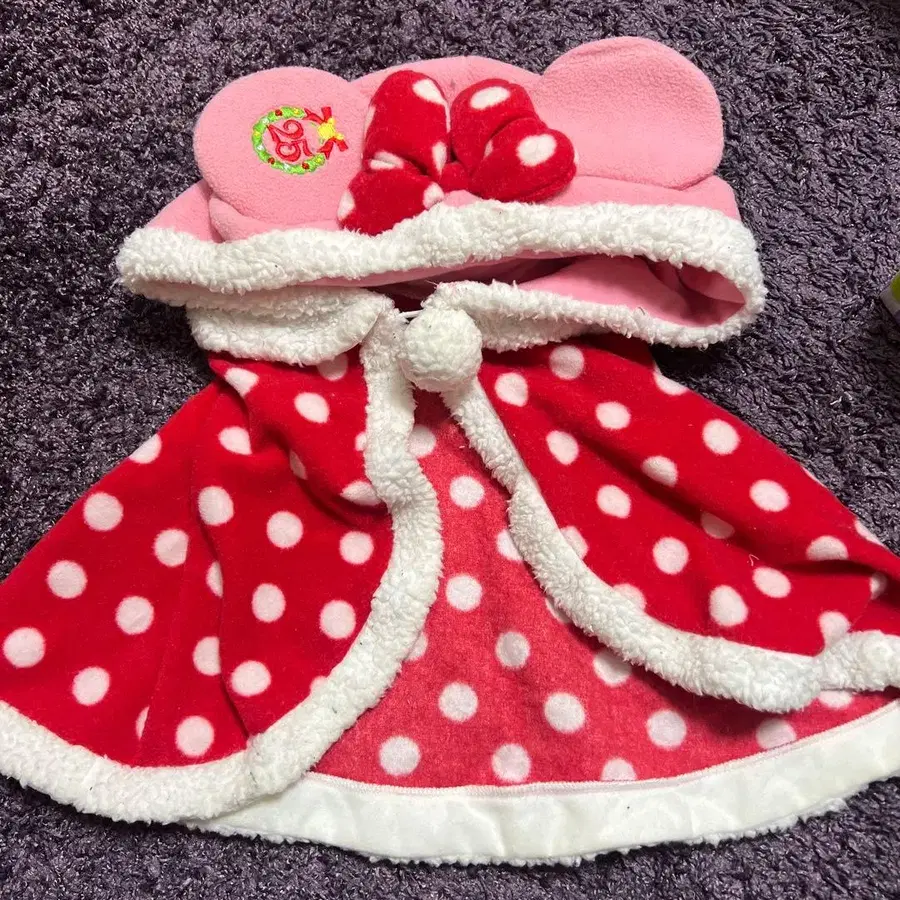 미니 마우스 귀가 특징인 따뜻한 플리스 소재의 후드 부착 케이프. - 디자인: 미니 마우스 귀 부착 디자인 - 색상: 빨간색과 핑크색 물방울 패턴 - 소재: 플리스 소재 - 특징: 후드 부착으로 따뜻함 방문해 주셔서 감사합니다.