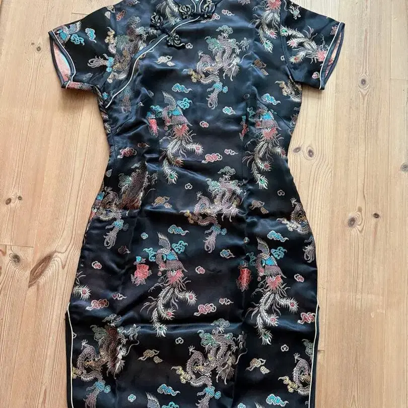 차이나 드레스 블랙 x 골드. 이미지보다 빛나는 제품입니다. 밑단 양쪽 사이드에 26cm 슬릿이 있습니다.