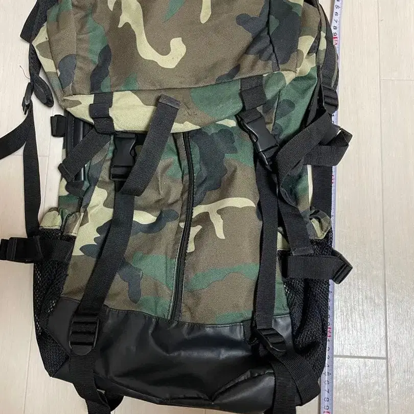 나일론과 합성 피혁 소재의 카모플라쥬 백팩, 내부는 대용량이며 다기능 스트랩이 있습니다.