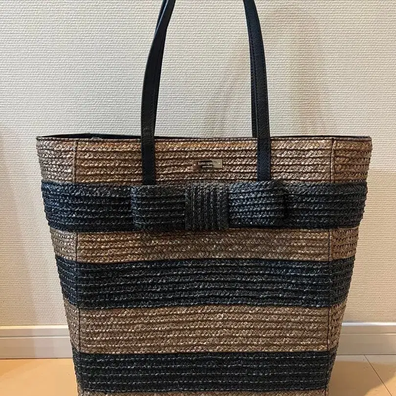 베이지와 블랙 스트라이프 디자인, 리본 포함 대용량 토트백. 방문해 주셔서 감사합니다.