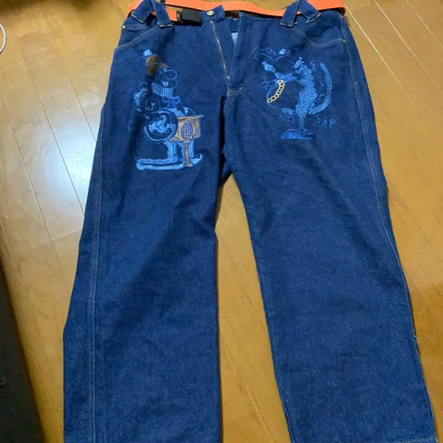 자수 디자인과 오렌지 허리 밴딩의 다크 블루 데님 팬츠. - 디자인: 자수 디자인 데님 팬츠 - 색상: 다크 블루 - 백 디자인: FARNESE 문자 자수 - 허리 밴딩: 오렌지 컬러 허리 밴딩 - 스타일: 스트레이트 핏 방문해 주셔서 감사합니다. 데님 컬러 - 블루