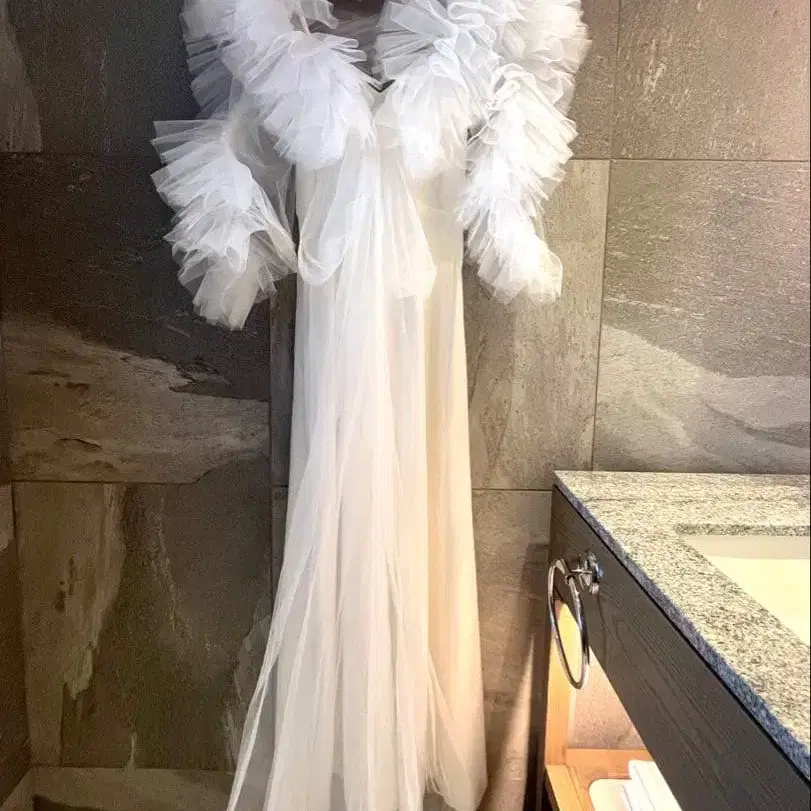 자동 번역되었어요. 원문보기프릴이 달린 화이트 웨딩 드레스입니다.