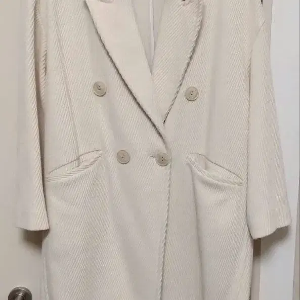 아이보리 더블 브레스트 롱 코트, 리브 디자인과 사이드 포켓 포함.