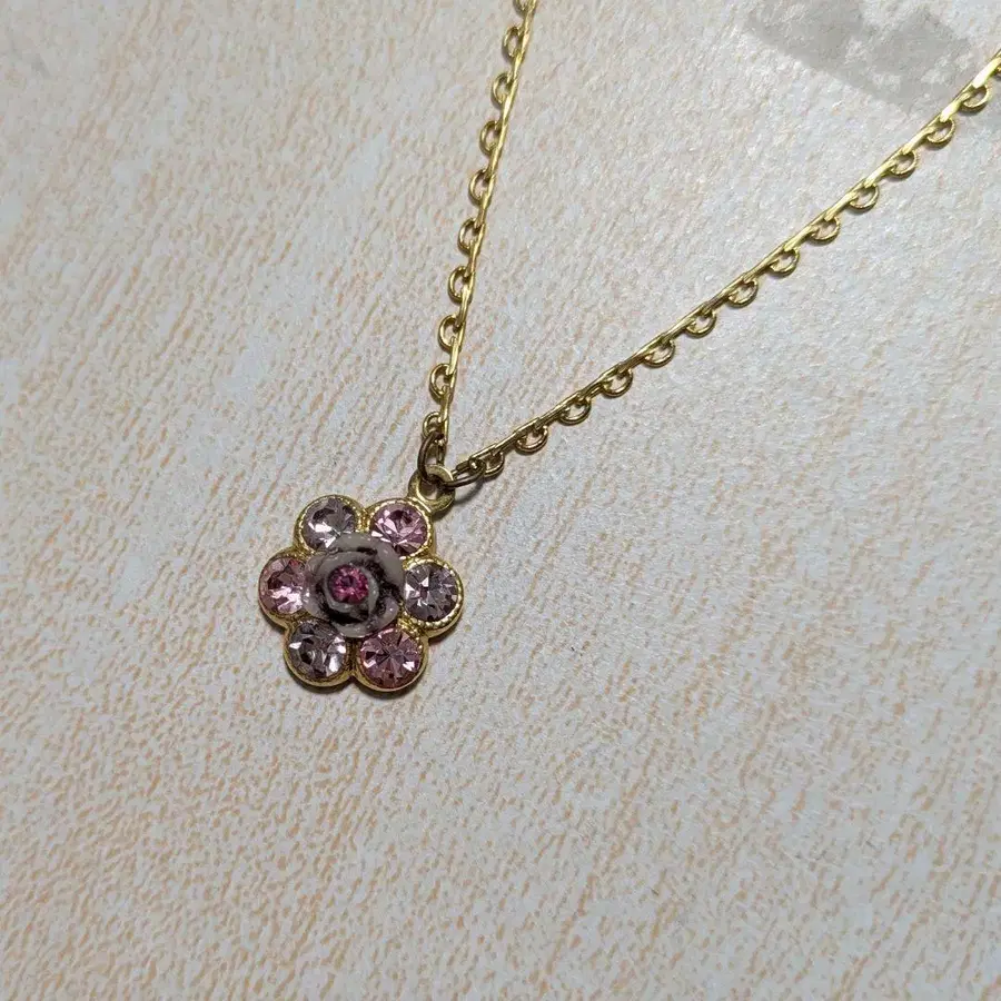 골드 체인에 꽃 모티브의 목걸이, 핑크 스톤이 화려합니다.