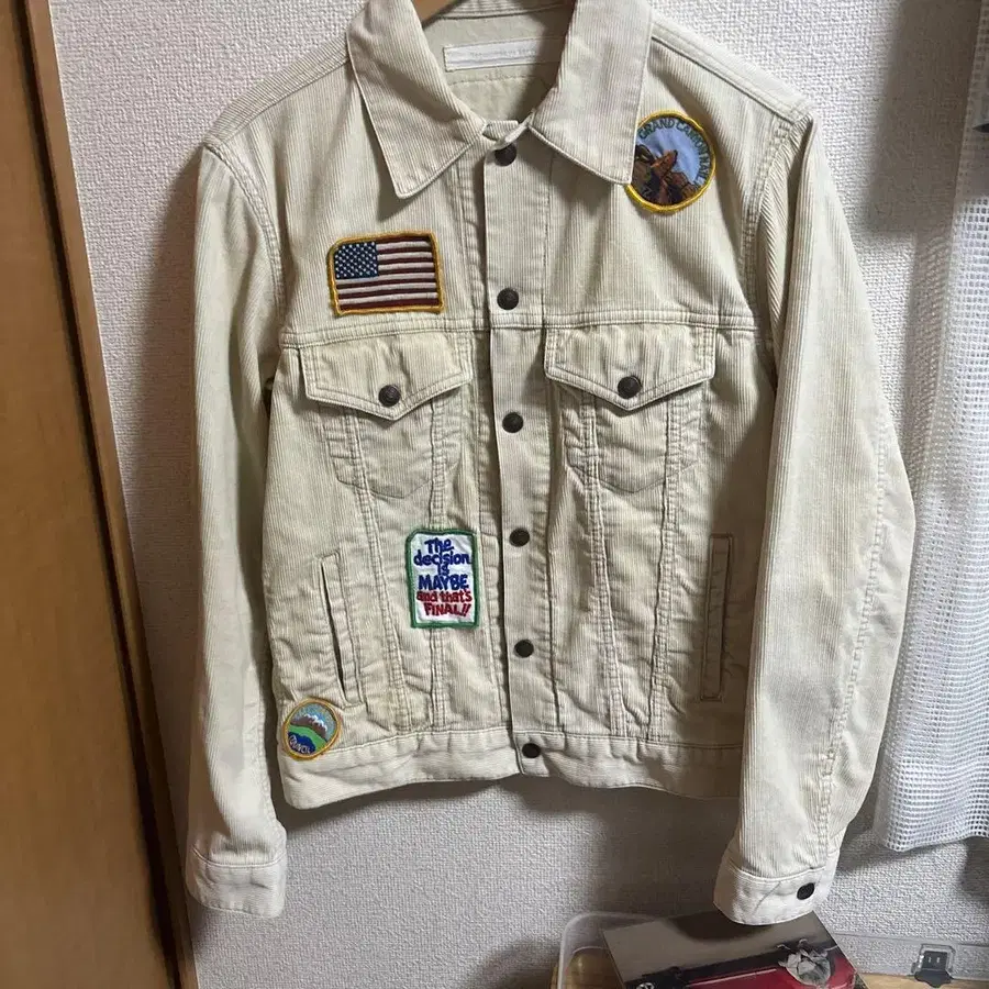 다양한 자수 패치가 들어간 베이지 색상의 데님 자켓.