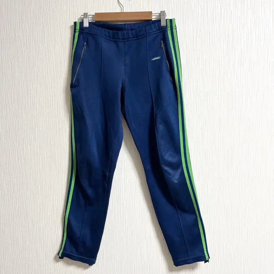 네이비와 그린 스트라이프가 특징인 트랙 팬츠, 지퍼 포켓 부착.