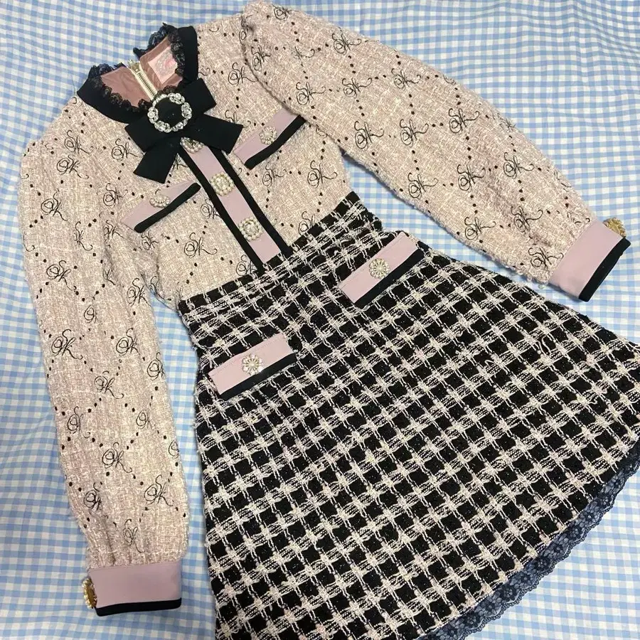 택 포함 새상품 미셸 마카롱 리본 트위드 미니 원피스 블랙 프리 사이즈