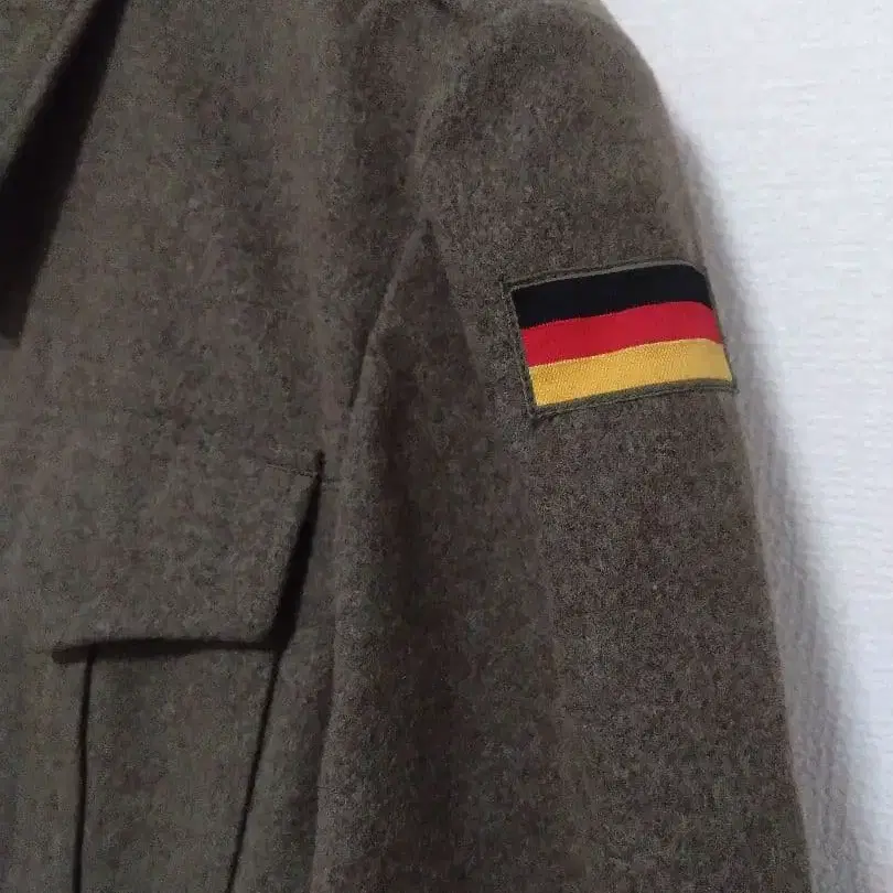 올리브 그린 색상의 울 소재 밀리터리 자켓이며, 독일 국기 와펜이 부착되어 있습니다.