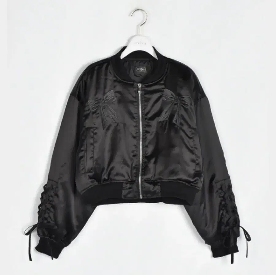 리본 장식이 특징인 블랙 새틴 봄버 자켓.
