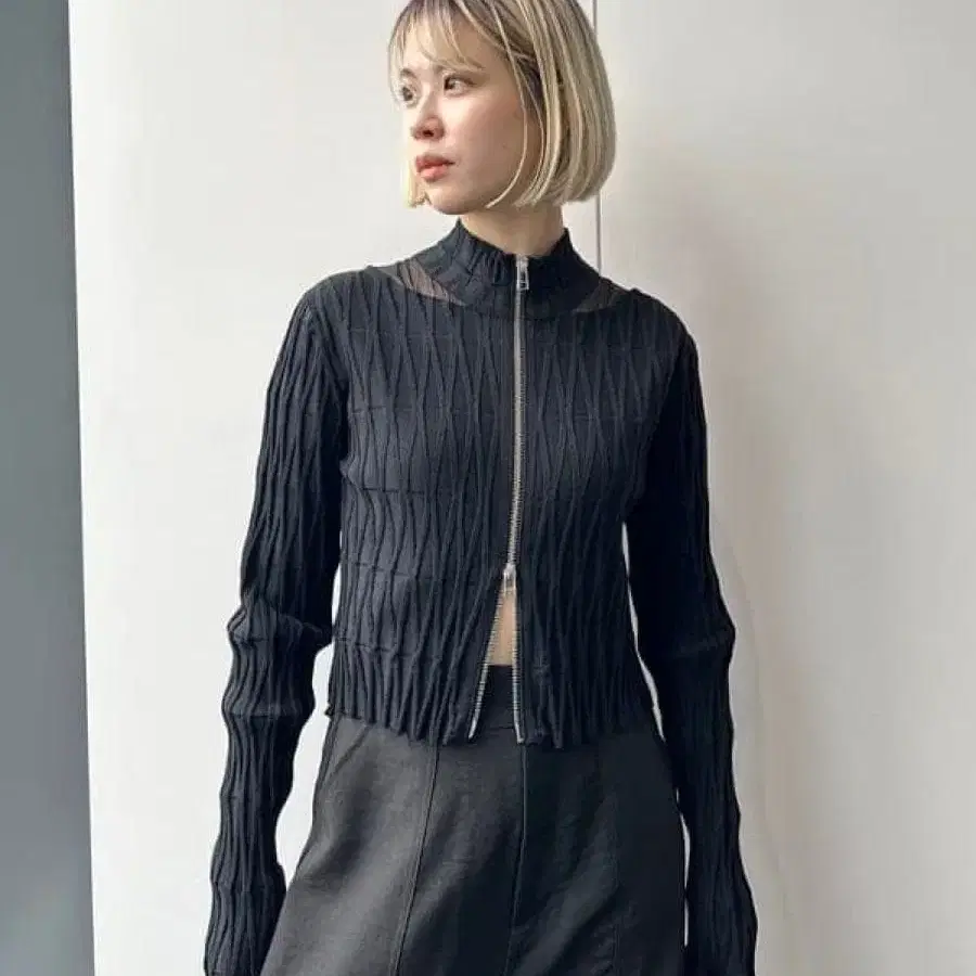 목 부분에 시어 소재를 사용하여 약간 내추럴한 느낌을 주는 상의는 더블 지퍼가 달려 있어 옷 스타일에 따라 분위기를 바꿀 수 있습니다.