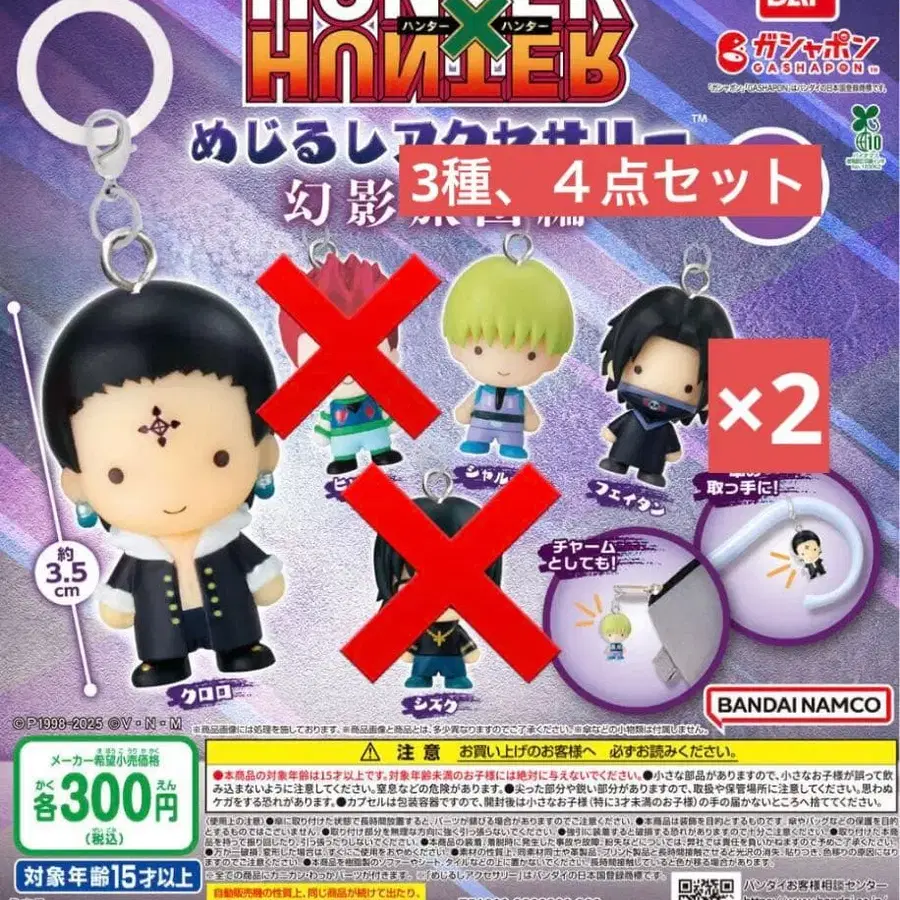 HUNTER x HUNTER 메지루시 액세서리 환영여단편 3종 4개 세트입니다. 클로로 샤르나크 페이탄 x 2 총 4개의 세트입니다. 미니북 포함 캡슐은 포함되지 않습니다. 새상품, 미개봉이지만 어디까지나 개인 보관임을 이해해 주십시오.