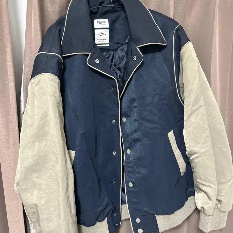 네이비와 그레이의 새틴풍 점퍼, 단추식 스타일로 사이드 포켓이 있습니다. - 색상: 네이비와 그레이의 콤비네이션 - 디자인: 단추식 스타일 - 소재: 새틴풍의 표면 - 특징: 대비되는 파이핑 - 포켓: 사이드 포켓 포함 방문해 주셔서 감사합니다. 사이즈 - M