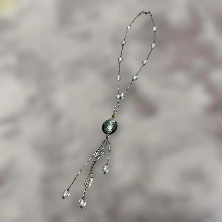 흐르는 듯한 디자인의 롱 목걸이, 유리 비즈 사용. - 디자인: 롱 목걸이, 비즈와 체인의 조합 - 소재: 유리 비즈, 금속 체인 - 색상: 그레이, 클리어 - 특징: 흐르는 듯한 디자인, 장식적인 비즈 방문해 주셔서 감사합니다.